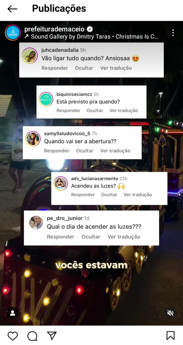 Por meio de suas redes sociais, a Prefeitura confirmou que a abertura contará com uma festa na orla da cidade com apresentação da Orquestra Filarmônica de Alagoas, celebração Eucarístca e desfile natalino.