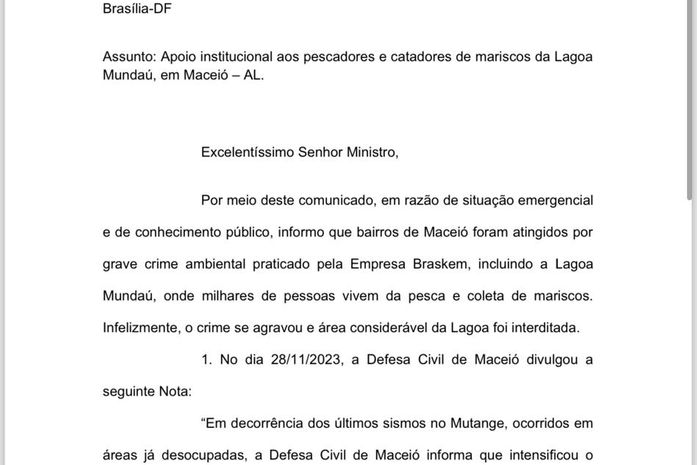 O deputado federal Alfredo Gaspar (União - Brasil), coordenador da Comissão que acompanha o afundamento do solo em Maceió na Câmara dos Deputados, protocolou, na sexta-feira (01), um ofício direcionado ao Ministro da Pesca e Aquicultura, André de Paula, e ao Presidente em exercício Geraldo Alckimin, em busca de apoio institucional urgente para a destinação de auxílio econômico-financeiro para pescadores e marisqueiras que há gerações tiram seu sustento da Lagoa Mundaú. As famílias podem ser as mais afetadas com o possível desabamento da mina-18, uma vez que grande parte dela está sob a Laguna.