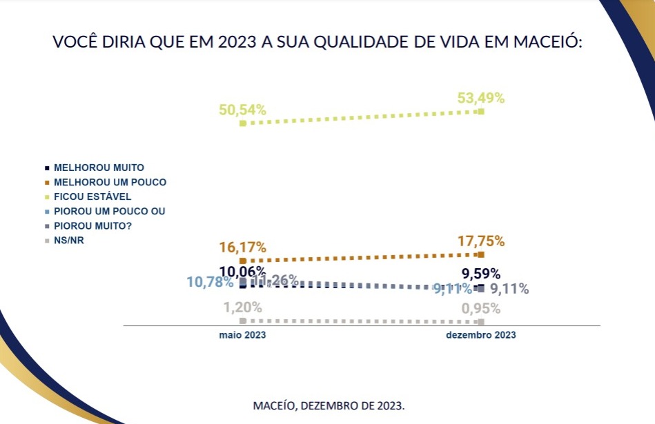 Uma pesquisa da Strategio, divulgada exclusivamente pelo CadaMinuto, nesta terça-feira (26), mediu a qualidade de vida e o nível de satisfação de viver em Maceió e revelou que mais da metade dos entrevistados percebeu que a qualidade de vida na capital ficou estável entre maio e dezembro de 2023.