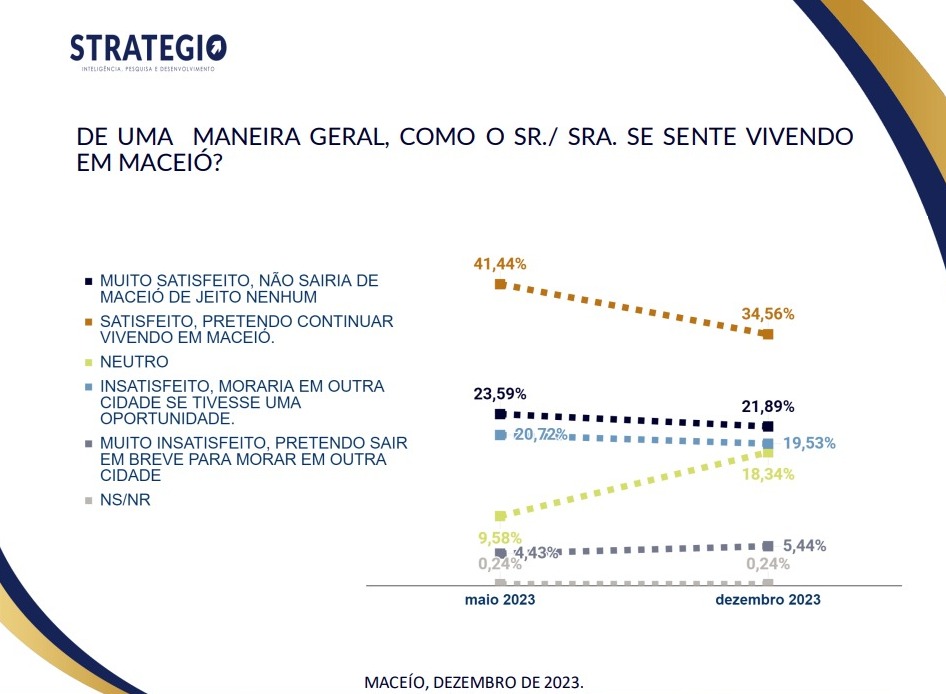Em dezembro de 2023, 21,89% dos entrevistados afirmaram estar muito satisfeitos e não sairiam de Maceió de jeito nenhum.