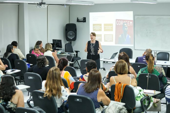 Inicialmente, os gestores assistiram a uma palestra da assessora especial da Semed, Rita Ippolito. Em sua apresentação, a especialista em educação trouxe um panorama, com dados, da rede nos últimos três anos, bem como traçou alguns pontos sobre os objetivos do plano de ação da Semed, os desafios e metas para a alfabetização dos estudantes na idade certa.