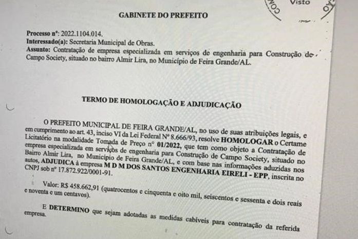 O tempo passou, a obra não se realizou e dois anos depois, em 2022, a Prefeitura fez uma nova licitação para a construção do campo. Desta vez, com a empresa M. M dos Santos Engenharia, com o valor de quase meio milhão de reais (R$ 458. 662. 91) e um Termo de Homologação e Adjudicação.