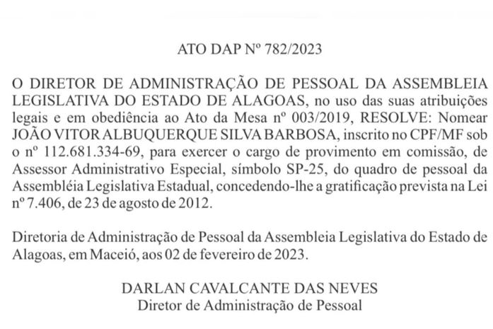 João Victor Albuquerque Silva Barbosa foi nomeado funcionário da ALE no dia 02 de fevereiro de 2023. Ele foi , nomeado através da portaria n°. 782/2023, assinada pelo diretor de administração de pessoal da Casa, Darlan Cavalcante das Neves.