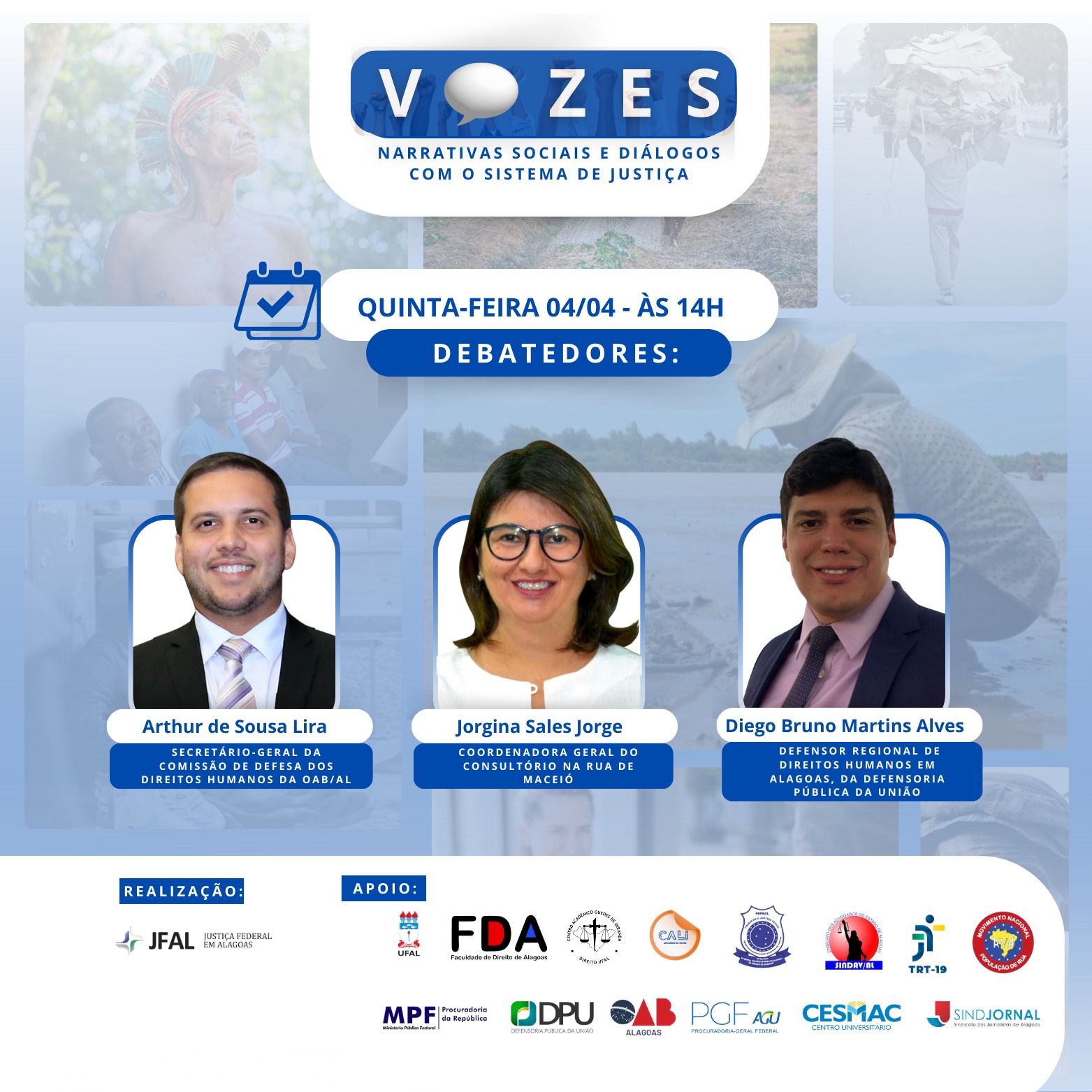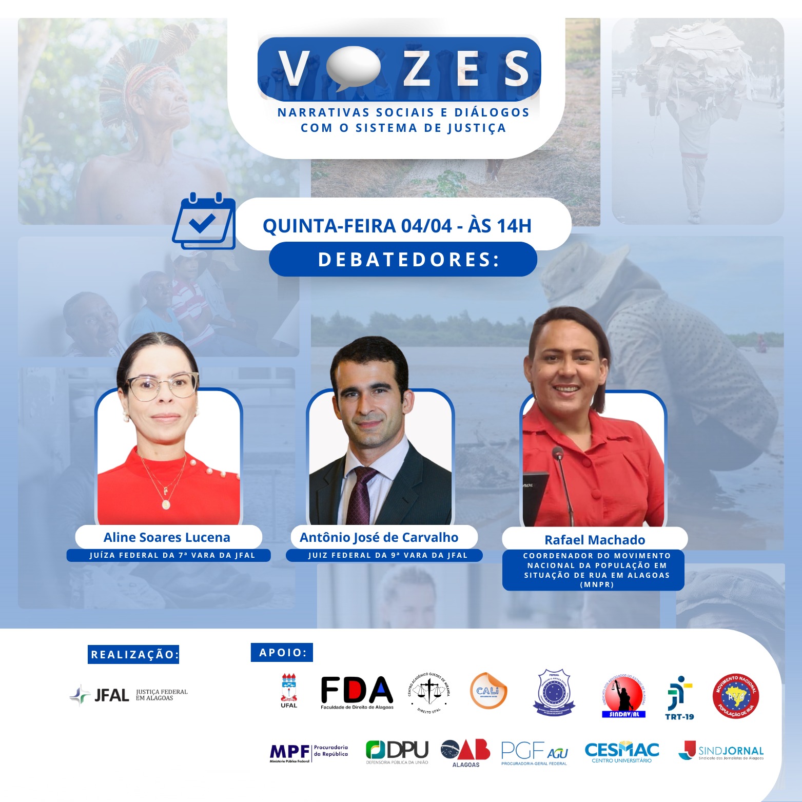 Está confirmada para esta quinta-feira, 4 de abril, a partir das 14h, a segunda etapa do Projeto Vozes: narrativas sociais e diálogos com o Sistema de Justiça. A iniciativa da Justiça Federal em Alagoas (JFAL) é proporcionar uma imersão de magistrados, servidores públicos, professores, estudantes, advogados, defensores públicos, promotores de justiça, entre outros, a fim de olhar de maneira mais humanizada para os temas que chegam ao Judiciário e envolvem comunidades em situação de vulnerabilidade.