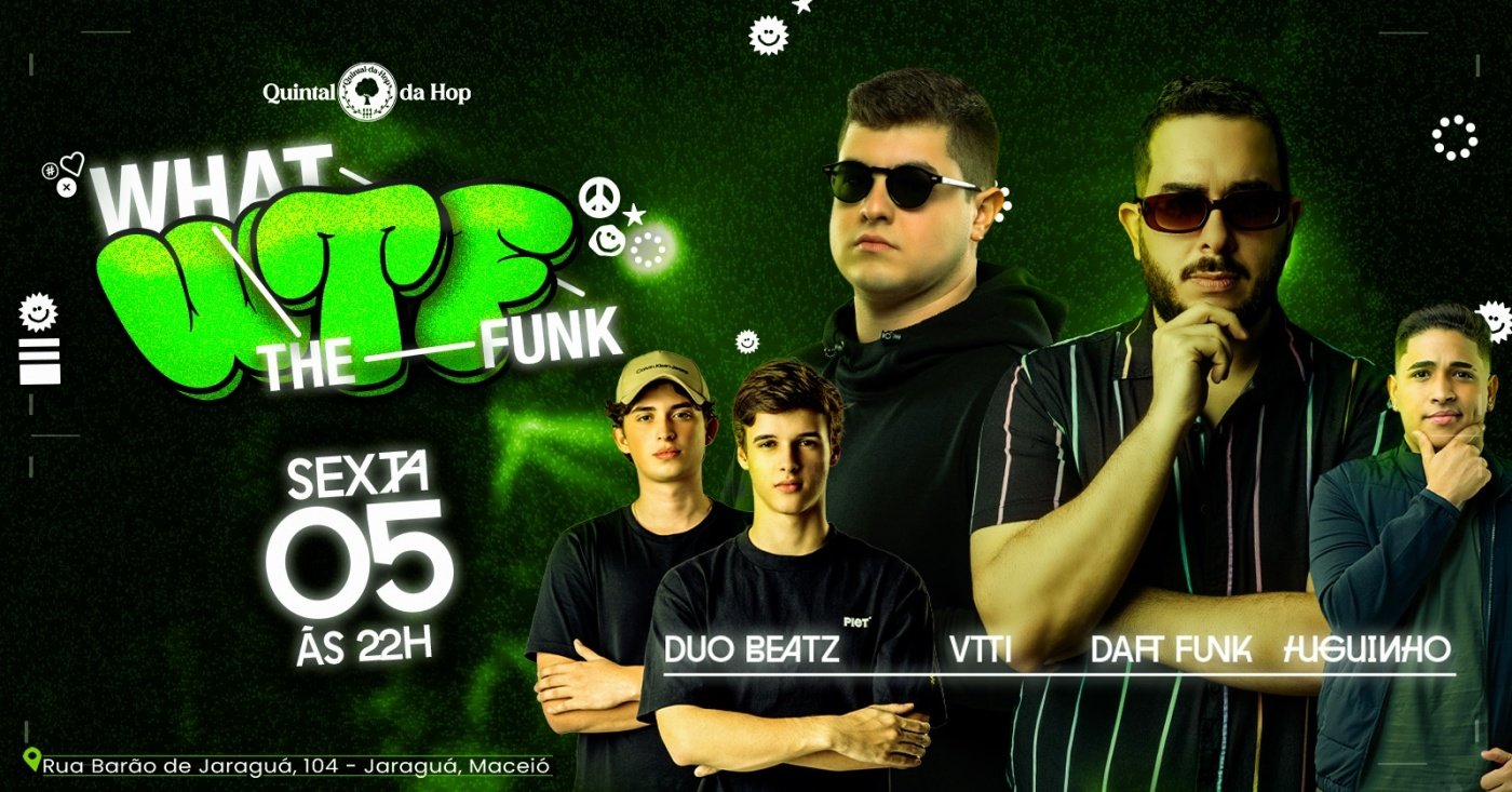 Ainda nesta sexta-feira (05), vai rolar uma noite de muito funk, com a festa What The Funk. O evento começa a partir das 22h, lá no Quintal da Hop.