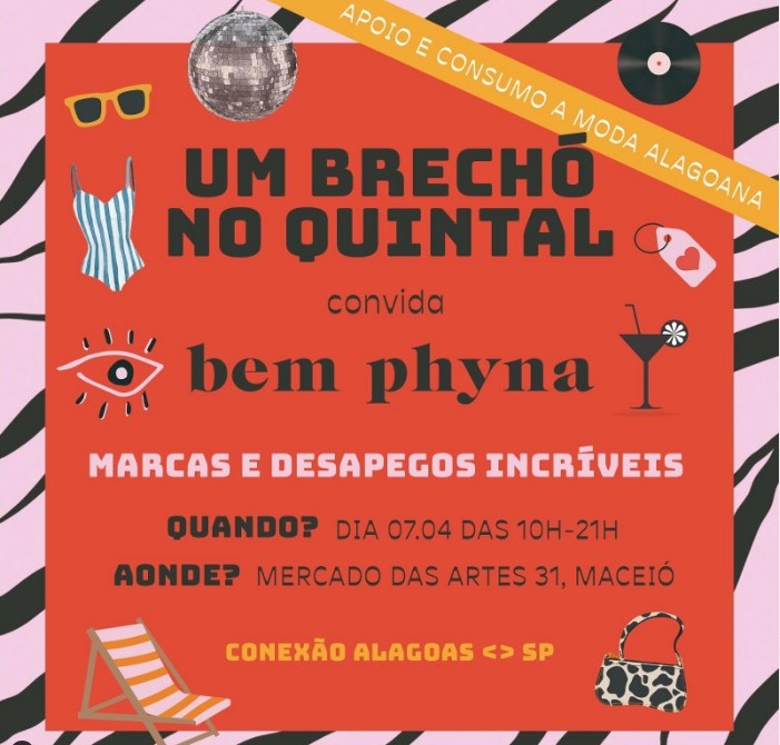 Por fim, você pode marcar presença no Um brechó do Quintal, com o brechó Bem Phyna, que vai acontecer lá no Mercado das Artes 31, das 10 horas da manhã até às 9 horas da noite.