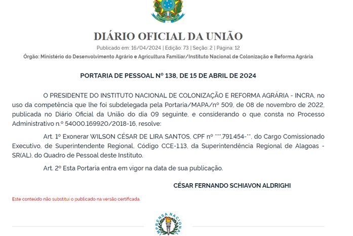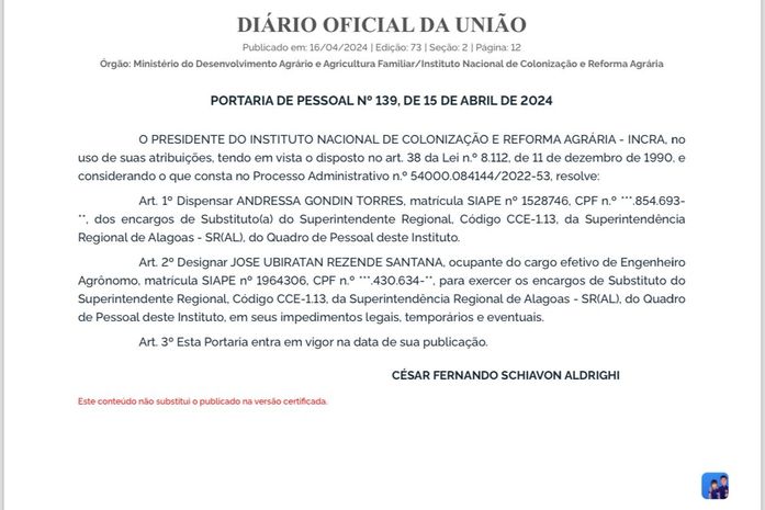 O agora ex-superintendente do Incra em Alagoas, César Lira, responde na justiça a uma ação movida pelo Ministério Público Federal (MPF). Ele é acusado de ter desviado diárias de viagens que não foram realizadas, pagas pelo governo a funcionários terceirizados, em 2023.