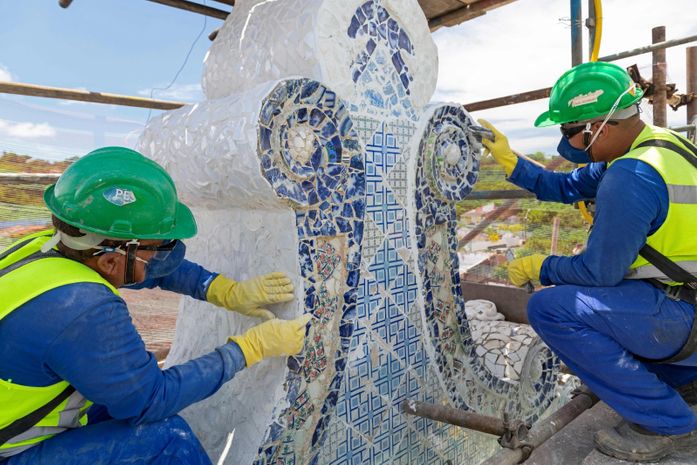 O trabalho de manutenção preventiva da azulejaria é feito manualmente e acontece em diferentes etapas. Primeiro são realizados testes de aderência para garantir a fixação das peças na parede; na sequência, o conjunto de azulejos passa por testes físicos e químicos, dessalinização e tratamento contra fungos; depois, a s peças são higienizadas e a pintura, recuperada. Quando necessário, algumas peças são restauradas. Ao final, uma camada de verniz é aplicada para proteção do revestimento. A previsão é que os serviços sejam concluídos no próximo mês de junho.