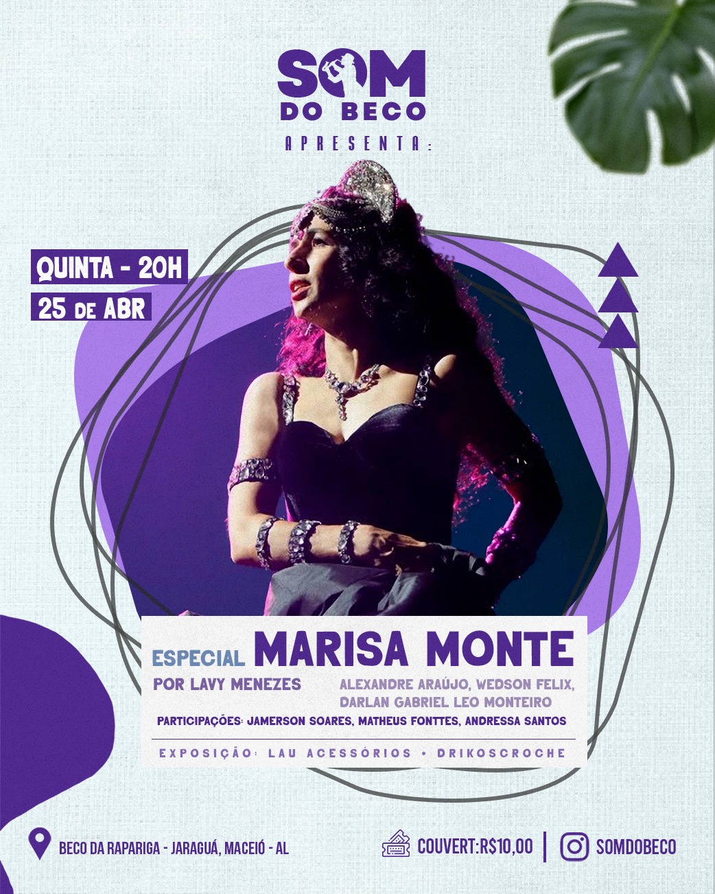 Ela promete uma total entrega, um momento de emoção e poesia, bem como para recordar as trilhas sonoras de novelas brasileiras. "Será uma homenagem a esta cantora que me inspirou a seguir na música", disse Lavy Menezes, artista que vai embalar a noite maceioense com o "Especial Marisa Monte" na próxima quinta-feira (25), a partir das 20h, no Som do Beco, Jaraguá.