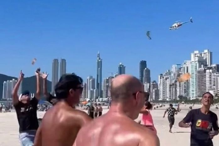 Um helicóptero provocou uma “chuva de dinheiro” na Praia Central de Balneário Camboriú na manhã deste domingo (21). Imagens publicadas nas redes sociais mostram a aeronave voando baixo sobre a faixa de areia e banhistas correndo para segurar as notas.