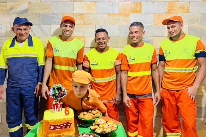 A noite da última quinta-feira (25) foi repleta de alegria, emoção e orgulho para o pequeno César, de 6 anos, e os garis de Maceió que foram convidados, a pedidos do garoto, para participar da sua festa de aniversário. Para o local escolhido ainda foi deslocado pela Autarquia Municipal de Desenvolvimento Sustentável e Limpeza Urbana (Alurb) um caminhão coletor, que é um dos brinquedos favoritos do menino.