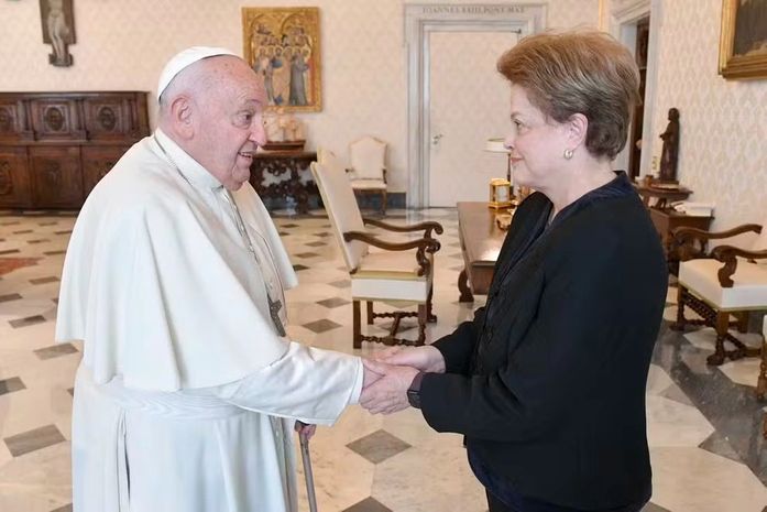 Segundo o Vaticano, a ex-presidente deu ao papa o livro “Theodoro Sampaio. Nos sertões e na cidade”, de Ademir Pereira dos Santos e recebeu de presente de Francisco a encíclica “Laudato si", a exortação apostólica “Laudate Deum” e uma escultura em bronze