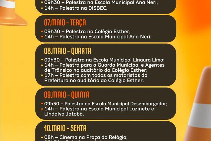 Durante essa semana, estão programadas palestras e ações voltadas para a educação e conscientização dos motoristas, com o intuito de contribuir para um trânsito mais seguro para todos.