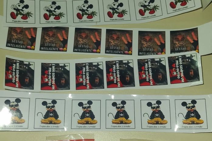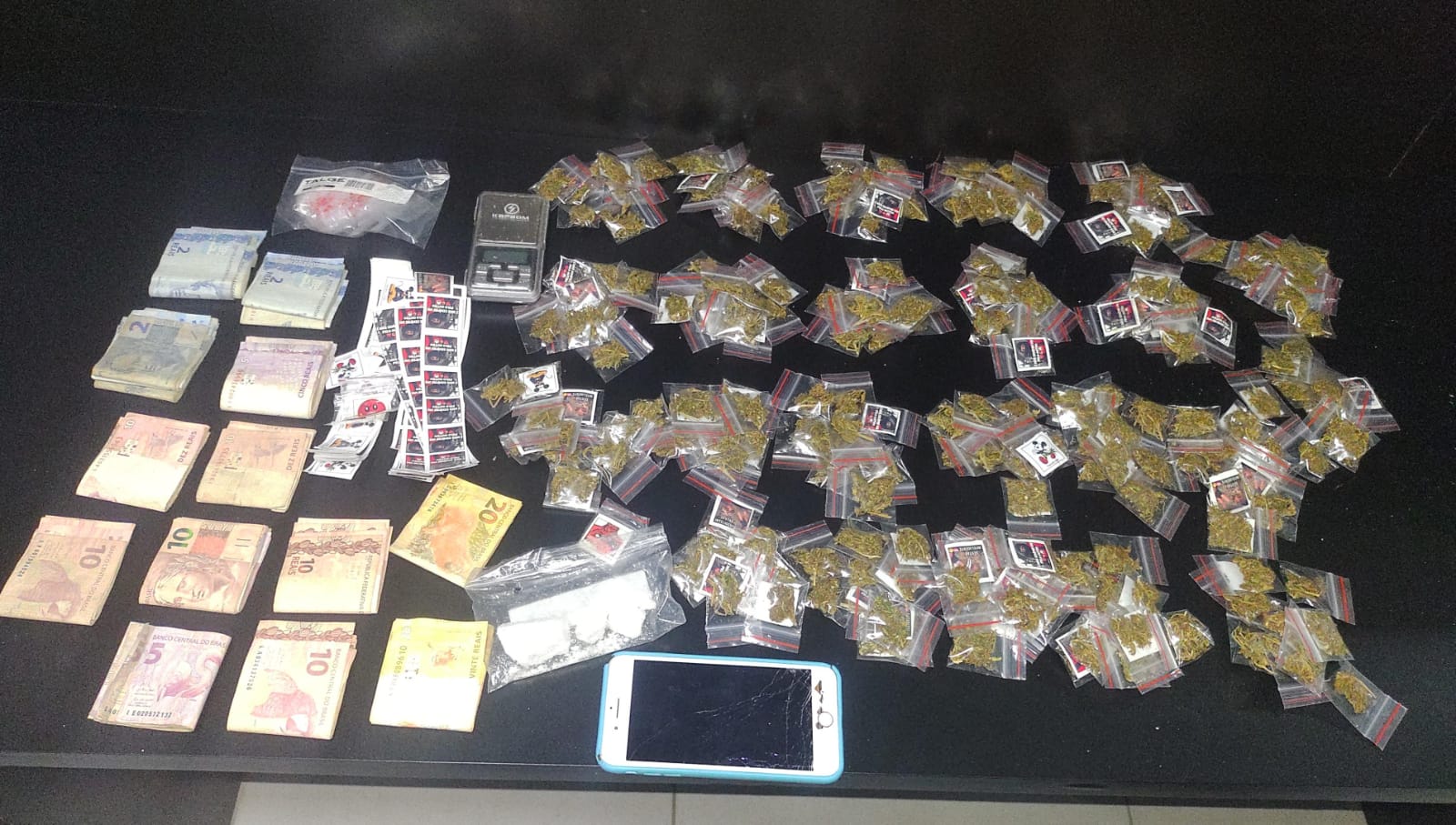 Na casa do suspeito, os policiais encontraram mais drogas, incluindo maconha em saquinhos, cocaína, uma balança de precisão, e R$610 reais em espécie. Além disso, foram encontrados adesivos personalizados com frases que pareciam estar relacionadas à atividade criminosa.