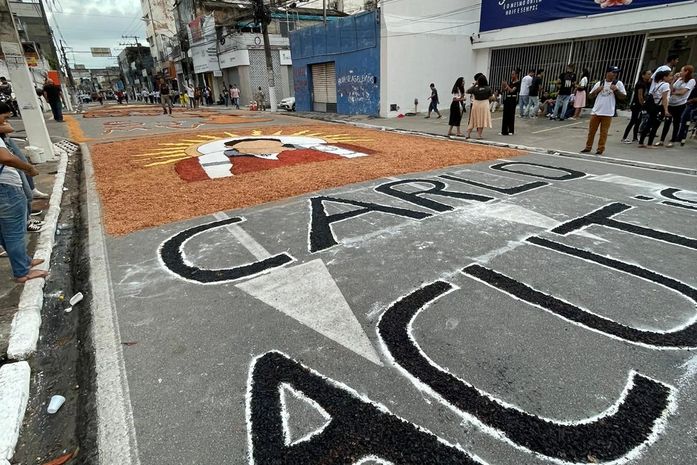 Durante o feriado de Corpus Christi, os católicos celebram e homenageiam a sagrada Eucaristia, e neste dia especial para os fiéis, é comum confeccionar tapetes de pó de serra, cal, café e outros materiais, representando a fé do povo católico.
