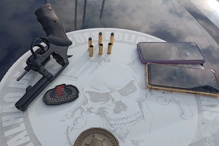 A polícia encontrou revólver e seis munições; três delas deflagradas e dois aparelhos celulares com o homem que foi atingido. Ele estava sendo investigado por diversos crimes, como homicídios e tráfico de drogas.