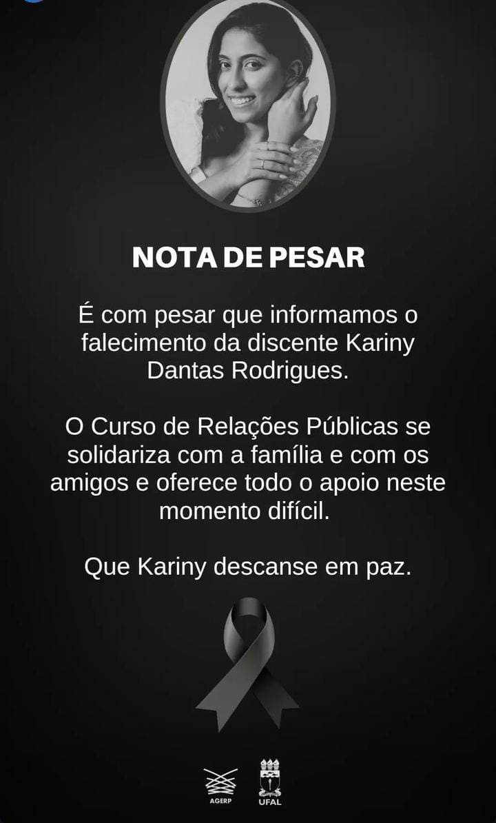 Kariny dos Santos era estudante do curso de Relações Públicas da Universidade Federal de Alagoas (Ufal). Em nota, o curso se pronunciou lamentando a morte da aluna e prestando solidariedade aos amigos e familiares.