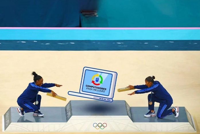 A presepada está resumida na imagem acima. Na foto original, Rebeca aparece no pódio recebendo a medalha de ouro, entre as americanas Simone Biles e Jordan Chiles, que ficaram com prata e bronze. As duas fazem um gesto de reverência à brasileira, numa atitude de repercussão mundial. Até Michele Obama elogiou o quadro. Este já é um dos momentos mais marcantes na história dos Jogos Olímpicos. Nada poderia dar errado.