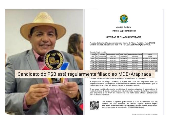 O vereador, que está concluindo o seu primeiro mandato, e na disputa pela reeleição, está filiado ao MDB em 08/04/2024, e ao mesmo tempo, requereu registro de candidatura à reeleição no PSB,