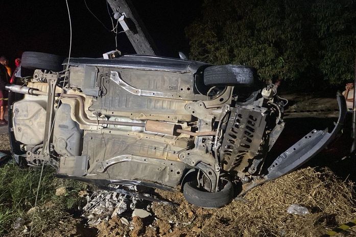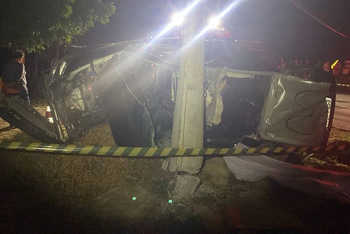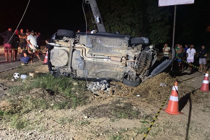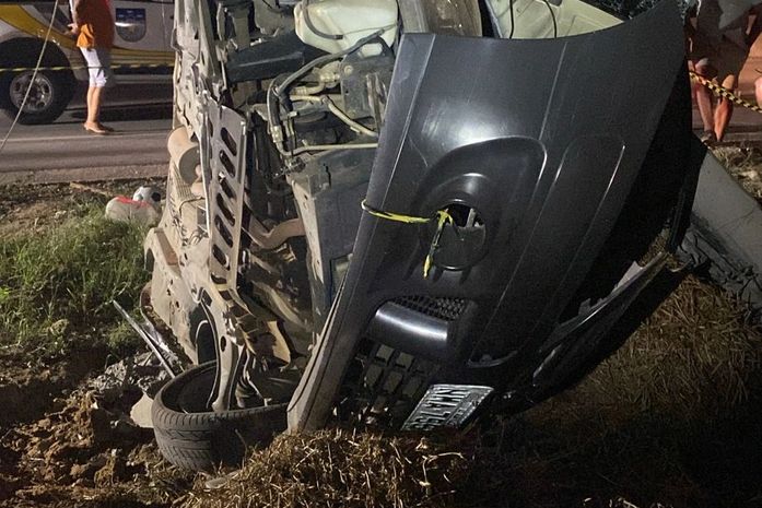 Ao tentar desviar para o lado direito, ele colidiu com uma mureta na margem da rodovia e com um poste, resultando no capotamento do veículo. O poste caiu sobre o carro.