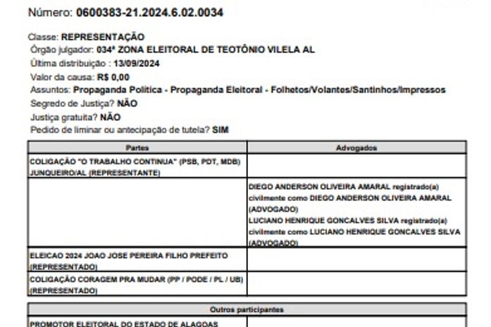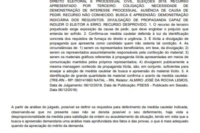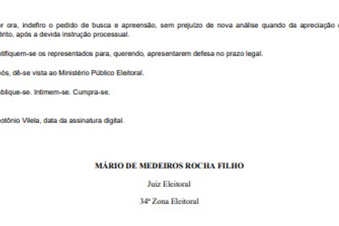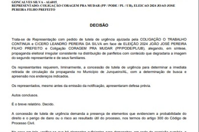 O juiz eleitoral da 34ª Zona, Sr. Mário de Medeiros Rocha Filho, proferiu uma decisão que determina a retirada imediata de materiais de campanha da coligação de Joãozinho Pereira, contendo acusações e informações enganosas contra o candidato Leandro Silva. A sentença foi proferida após constatação de que o conteúdo visava prejudicar a candidatura do opositor nas eleições de Junqueiro.