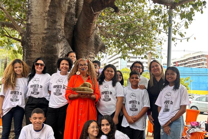 Nesta quinta-feira,26, sob o sol tímido no Corredor Vera Arruda, área nobre de Maceió, o Coletivo de Estudantes Negr@s e Aliad@s,( CENA) formado por meninas e meninos da Escola Padre Pinho foram os protagonistas da Cerimônia de Colheita do Mukua, fruto do Baobá.