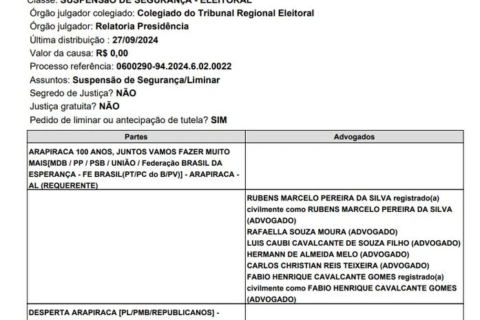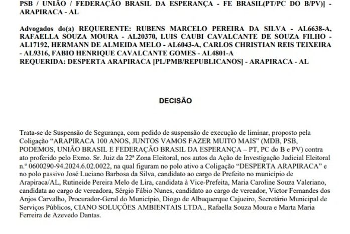 Por telefone, a assessoria da coligação “Arapiraca 100 Anos, Juntos vamos fazer muito mais” celebrou a decisão como uma garantia de que o processo eleitoral segue sem interferências externas que possam prejudicar a disputa. A coligação também reforçou seu compromisso com a legalidade e a transparência durante o período eleitoral.