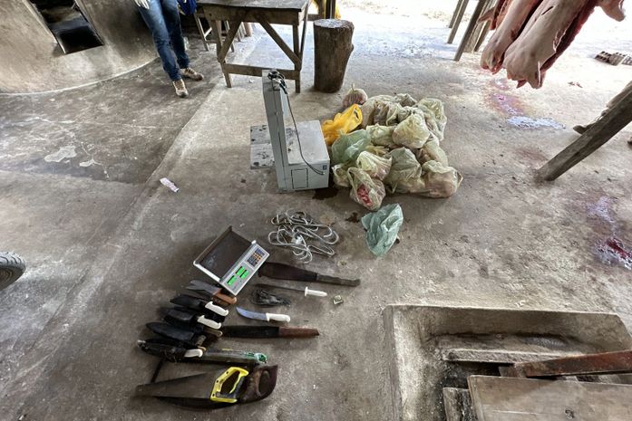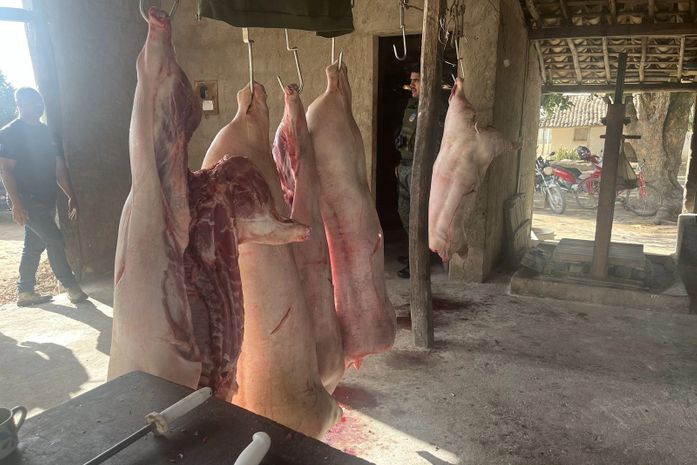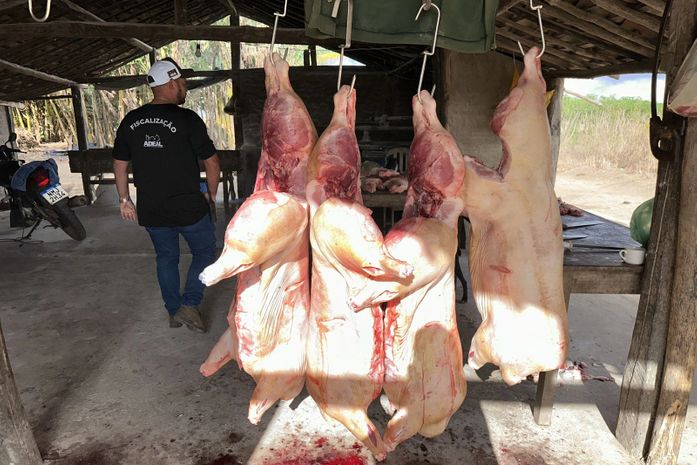 No local foram apreendidas cinco carcaças de suínos e cortes em péssimo estado de conservação, sem tratamento de refrigeração, em ambiente insalubre, sem higiene e sem controle do descarte de resíduos ou observação às normas sanitárias. Não havia nem fonte de água para higienização das ferramentas e dos trabalhadores.