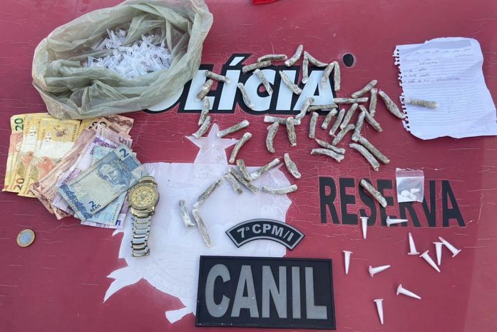 A ação das equipes da 7ª Companhia de Polícia Militar Independente (CPM/I) juntamente com o canil do 3º Batalhão de Polícia Militar (BPM) apreendeu 13 pinos de cocaína, 47 bombinhas de maconha, R$ 170,00 em espécie, um relógio e centenas de pinos vazios para acondicionamento e comercialização de cocaína.