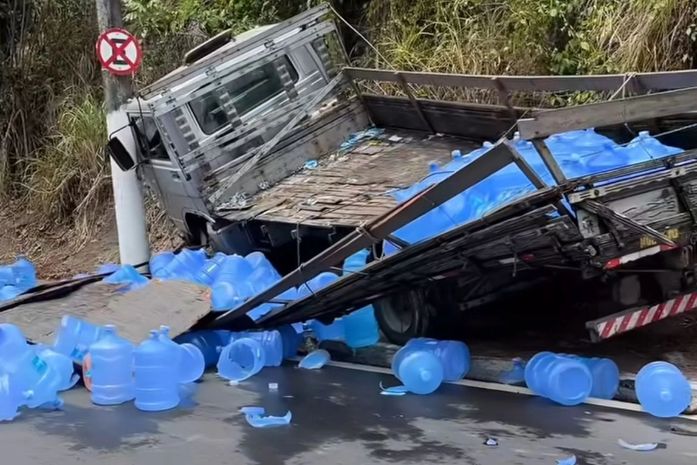 Um caminhão carregado de galões de água se envolveu em um acidente na Avenida Leste-Oeste, próximo à ladeira do Bolão, e parte da carga se espalhou para o meio da pista. O caso ocorreu na manhã desta segunda-feira (2).