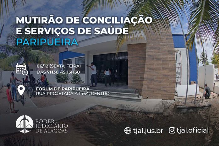 O mutirão será realizado das 7h30 às 13h30, no Fórum de Paripueira e no Centro Judiciário de Solução de Conflitos e Cidadania (Cejusc), ambos localizados à Rua Projetada A 1464, Centro.