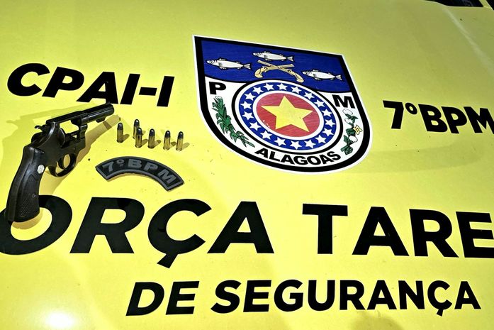 Com o apoio dos Grupamentos de Polícia Militar (GPMs) de Carneiros e Palestina, os policiais localizaram o suspeito, que tentou fugir ao perceber a aproximação das autoridades. No entanto, ele foi rapidamente contido e encontrado com um revólver calibre 32, contendo seis munições intactas, na cintura.