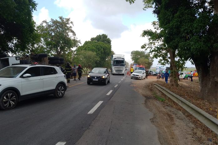Uma caçamba tombou após colidir com um carro passeio manhã desta segunda-feira (16), na rodovia BR-316, no município de Pilar, Região Metropolitana de Maceió.