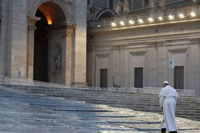 Um homem só, rezando por todos numa praça vazia. Era a pandemia que matou tantos irmãos. Ali a aparente solidão o fez farol para muitos.