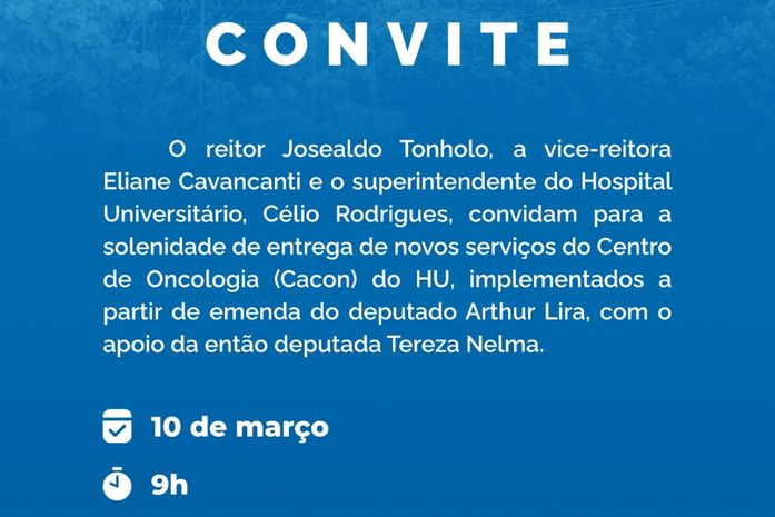 Em uma boa conversa com Josealdo Tonholo, o magnífico reitor da Universidade Federal de Alagoas, esta ativista, recebeu convite para participação na solenidade de entrega do serviço de radiocirurgia do Centro de Oncologia do Hospital Universitário- CACON/HU, que acontece na manhã da segunda-feira, 10 de março..