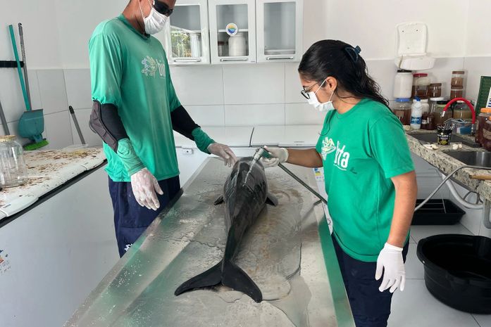 Ainda segundo o especialista, o corpo do golfinho estava em estado de conservação recente, o que pode auxiliar na análise das condições que levaram ao óbito.