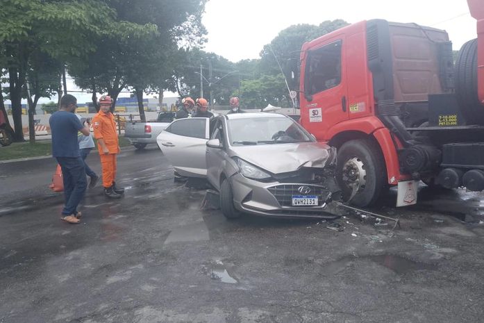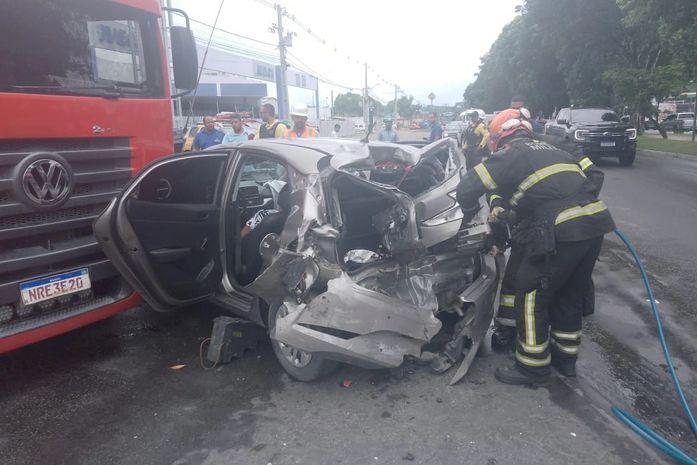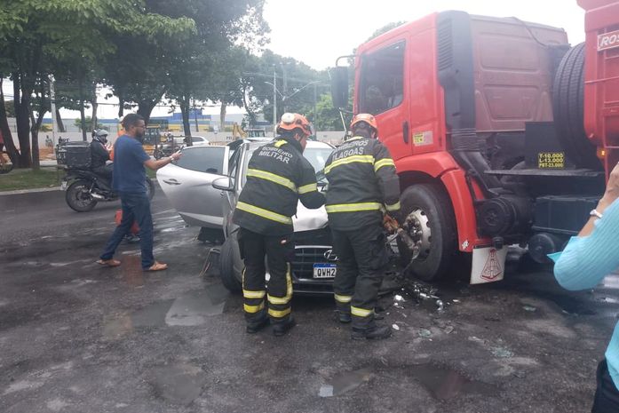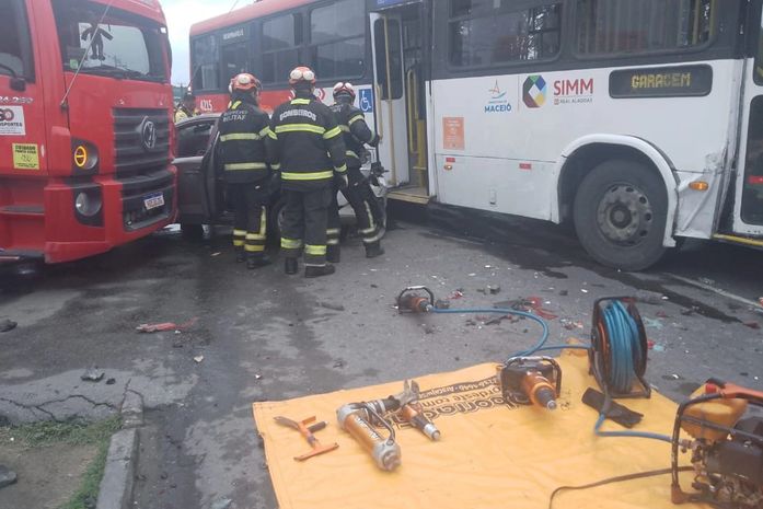 Uma mulher ficou ferida e presa às ferragens e o carro foi prensado entre um ônibus e um caminhão, após acidente registrado na manhã desta sexta-feira (14), na avenida Durval de Góes Monteiro, no Tabuleiro do Martins, em Maceió.