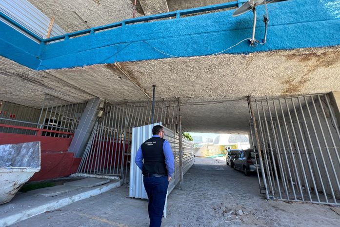 Na manhã desta quarta-feira (26), o vereador Leonardo Dias esteve no Estádio Rei Pelé, no Trapiche da Barra, onde foram constatadas ferragens expostas, crateras e rampas sustentadas com escoras.