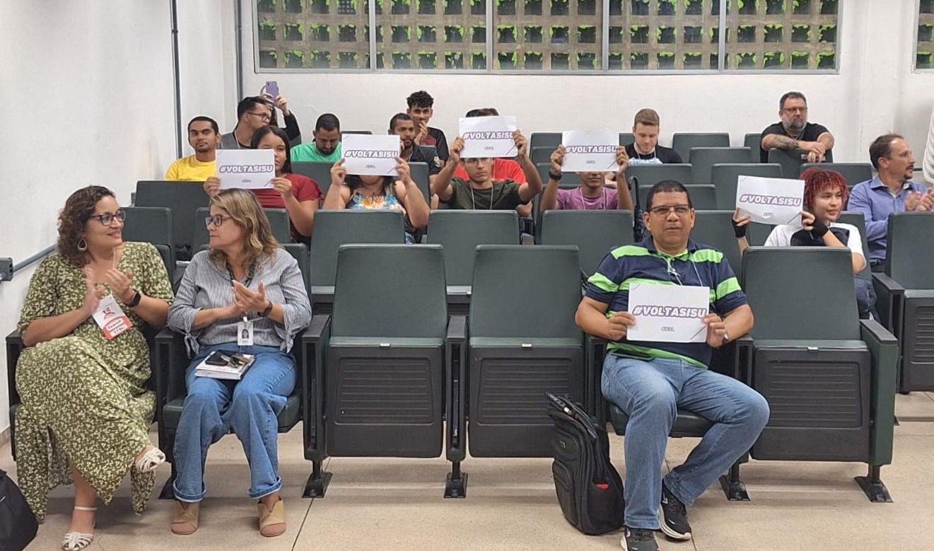 Durante a abertura do evento, que celebra os 15 anos do Curso de Licenciatura em Matemática do Ifal Maceió, estudantes exibiram cartazes de #VoltaSisu.