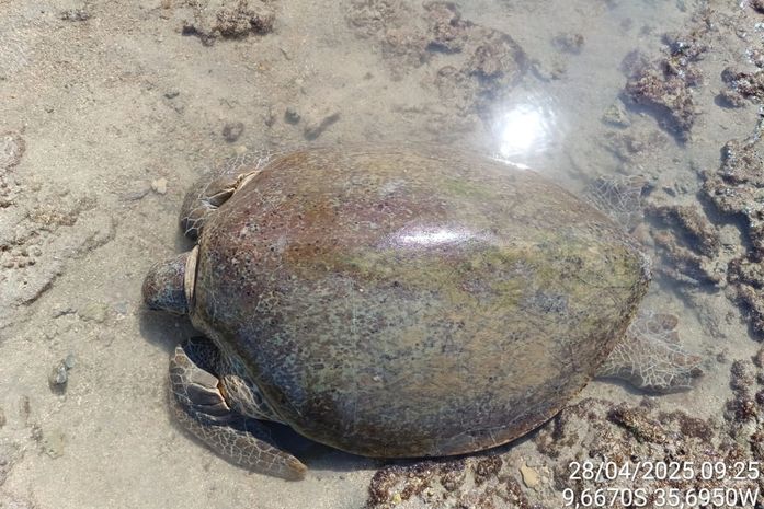 Uma tartaruga-verde,Chelonia mydas, foi encontrada presa em um curral de pesca na praia da Ponta Verde, em Maceió. O caso foi registrado neste domingo (27). A espécie marinha está ameaçada de extinção.