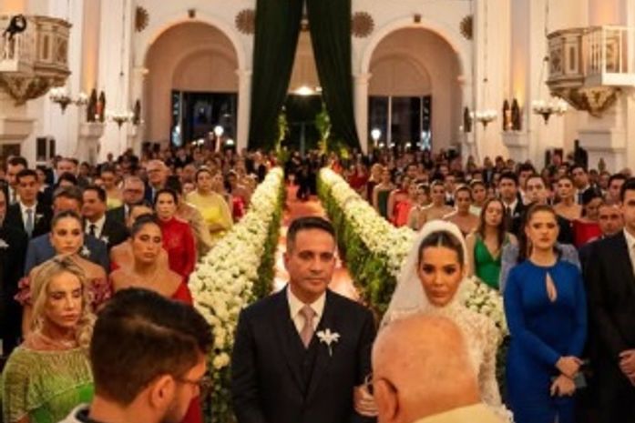 O templo, um dos mais imponentes da capital alagoana, foi cuidadosamente decorado com rosas brancas, criando um cenário de elegância e sofisticação para o tão aguardado casamento.