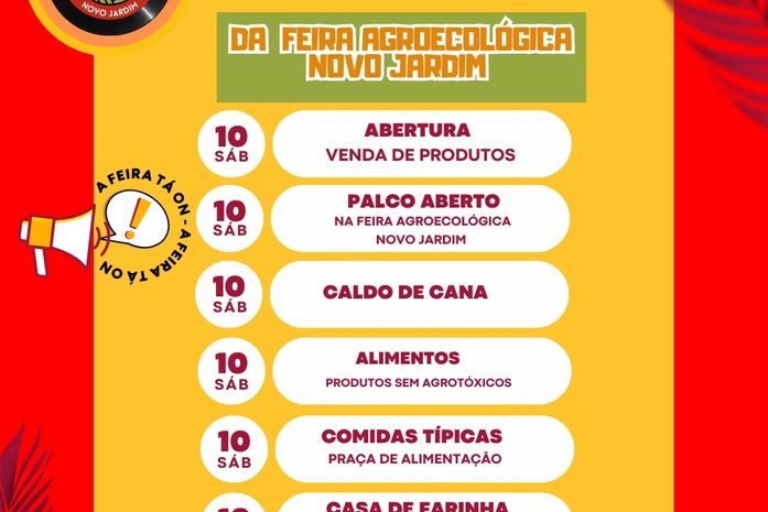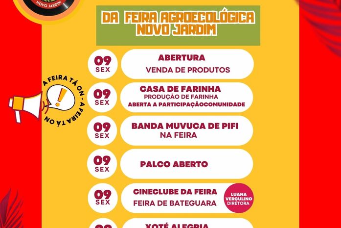 “A feira chega junto com uma programação cultural potente, pensada para todas as idades e gostos, misturando tradição, sustentabilidade e muita criatividade, a proposta é simples: fortalecer os laços entre quem planta e quem consome, valorizando a agricultura familiar, os saberes populares e a cultura local”, comenta Diana Aleixo, uma das organizadoras e gestoras da Feira Agroecológica Novo Jardim.