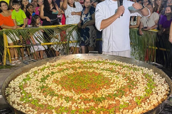Na panela gigante que vai perfumar o povoado, entram ingredientes que contam histórias do sertão: 15 kg de carne de sol, 15 kg de queijo coalho, 15 kg de arroz, 15 kg de feijão, além de bacon, linguiça, coentro, alho, cebola e, claro, muita manteiga de garrafa. É cozinha de raiz, de afeto, de partilha. E o tempero vai além do prato: é cultura servida à beira do São Francisco.