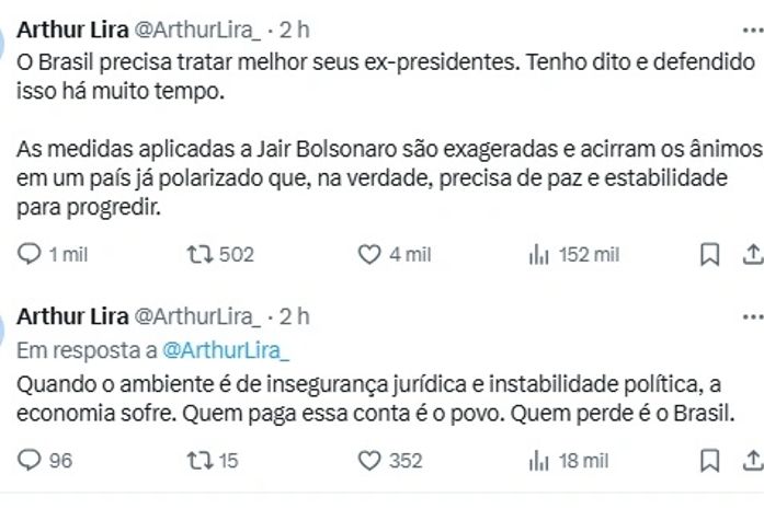 O ex-presidente da Câmara dos deputados, deputado Arthur Lira, defendeu que as medidas aplicadas pelo ministro Alexandre de Moraes, do Supremo Tribunal Federal (STF), ao ex-presidente Jair Bolsonaro são exageradas e acirram os ânimos em um país já polarizado.