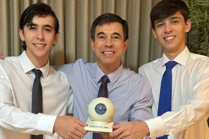 Oftalmologista Aydano Ferraz ao lado dos filhos, Arthur e Bruno, que seguem seus passos na medicina, renovando o propósito e fortalecendo a missão da família no cuidado com a visão.