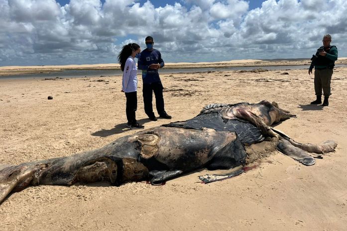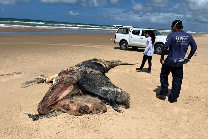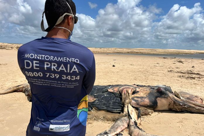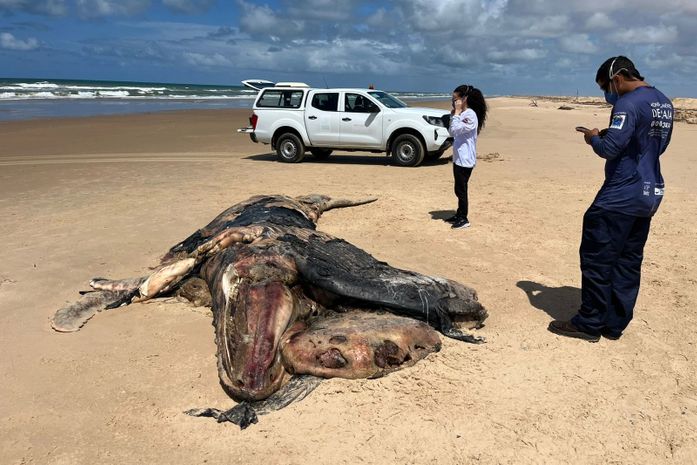 Um baleia-jubarte juvenil, com cerca de seis metros de comprimento, foi encontrada morta e em avançado estado de decomposição nesta terça-feira (12), na Praia do Pontal do Peba, em Piaçabuçu, litoral sul de Alagoas. A remoção do animal, que apresenta marcas de mordida de tubarão e desprendimento de pele, foi adiada devido à maré alta e está prevista para esta quarta-feira (13), às 11h.