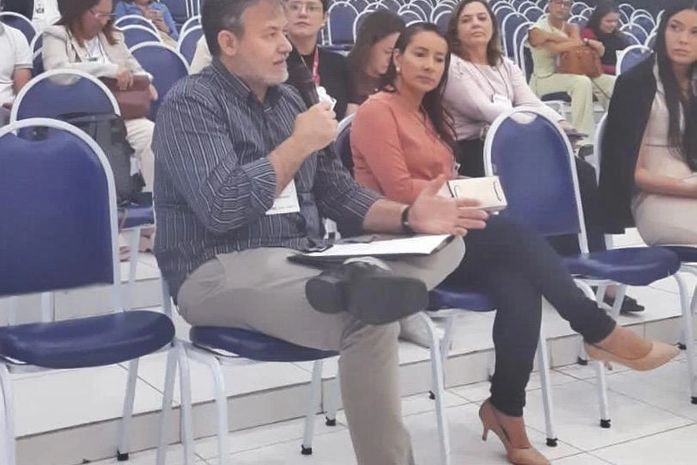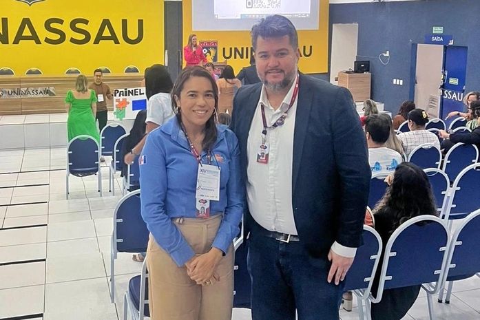 O diretor do Conselho de Secretarias Municipais de Saúde de Alagoas (Cosems-AL) e secretário de Saúde de Palestina Bruno Galindo e a assessora técnica Mirna Vaz, representantes da pauta da Política Nacional de Humanização (PNH), participaram nesta quarta-feira (20) do XIV Seminário Estadual de Humanização em Alagoas, na Uninassau, em Maceió.