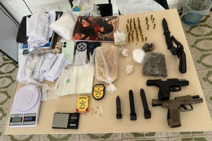 A operação resultou ainda na apreensão de três armas de fogo, munições de calibres 9mm, .380 e .38, além de grande quantidade de cocaína, crack e maconha. Cadernos com anotações e registros do tráfico também foram recolhidos e devem reforçar as investigações.
