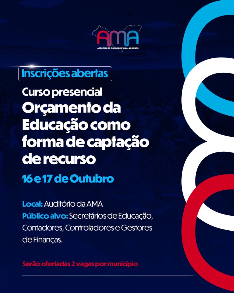 A Associação dos Municípios Alagoanos (AMA) abriu inscrições para o curso “Orçamento da Educação Como Forma de Captação de Recursos: Um Olhar Direto para o CAUC”, que acontece nos dias 16 e 17 de outubro, em formato presencial, na sede da entidade, em Maceió.