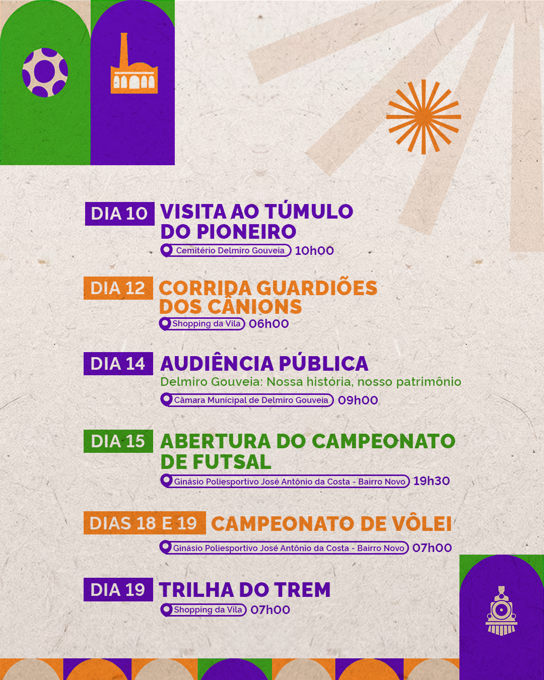 O esporte também marca presença com a Corrida Guardiões dos Cânions, no dia 12, às 6h, no Shopping da Vila. No dia 14, a Câmara Municipal sedia uma audiência pública com o tema Delmiro Gouveia: Nossa história, nosso patrimônio, a partir das 9h. Já no dia 15, às 19h30, acontece a abertura do Campeonato de Futsal, no Ginásio Poliesportivo José Antônio da Costa, que também recebe, nos dias 18 e 19, o Campeonato de Vôlei. Encerrando a programação, no dia 19, acontece a tradicional Trilha do Trem, com saída do Shopping da Vila, às 7h.